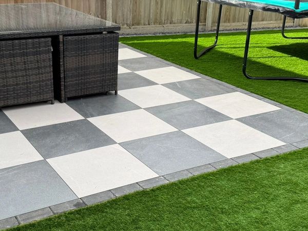 For a valued repeat client, JMCS Ltd transformed an outdoor space with a bespoke landscaping solution. The project included the installation of a contemporary checkerboard patio and high-quality artificial grass, creating a clean, low-maintenance garden ideal for family living.